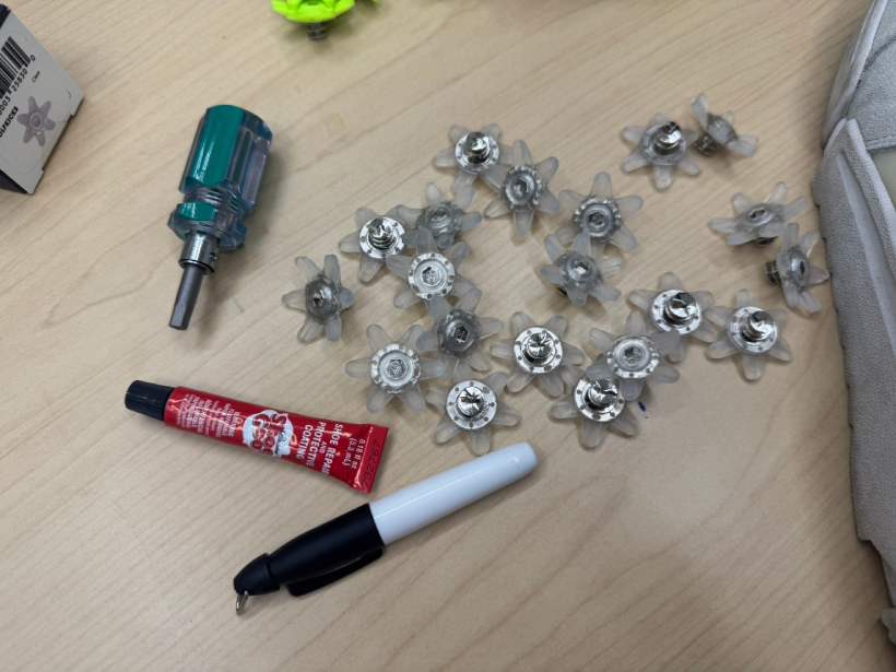 次に、印に接着剤のつけたスパイク鋲をドライバーを使って取り付けていく。場所によってはうまく装着ができないところもあるのだが、女性の私でも一人で取り付けられるほど、コツを掴めばとにかく簡単。