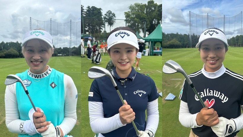 政田夢乃(下写真中)も同様に58度をテスト。「打音の違いをまず感じました。より音が出るようになったのかな? フェースの乗り感も良く、スピンがしっかりかかります。今後、さらにテストを重ねていきたいです」