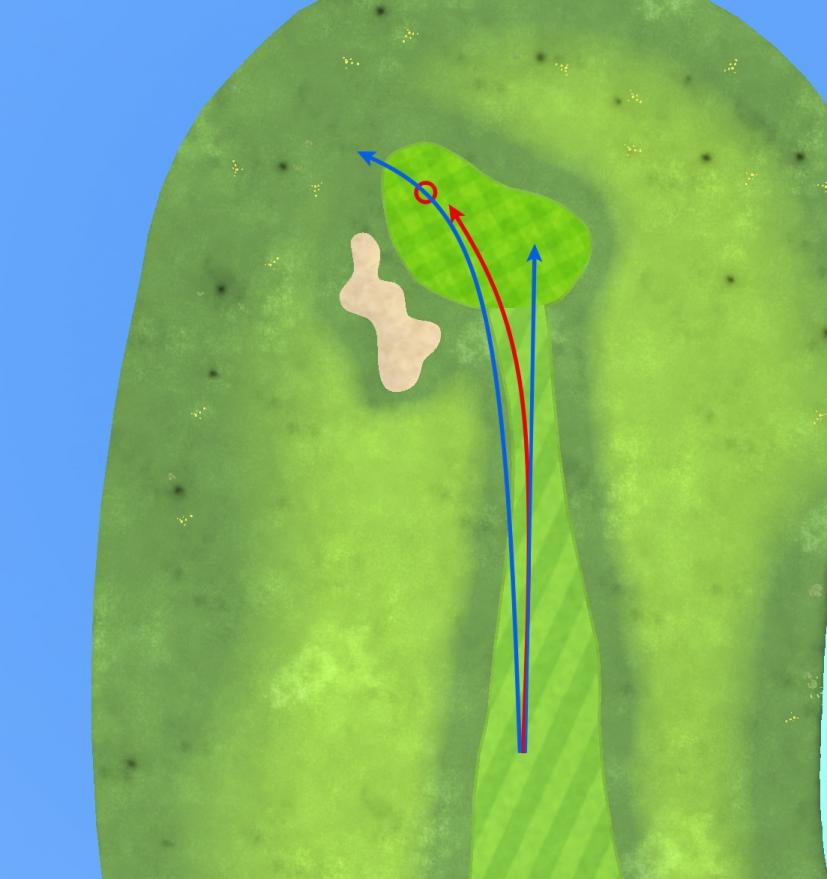 左にあるピンに対して、ドローで右から曲がるボールが有利!と考える方が多いのですが、これは、以前ドッグレッグホールでのティショットで述べさせていただいたように、絶対に有利か?というとそうでもないことが多いです。