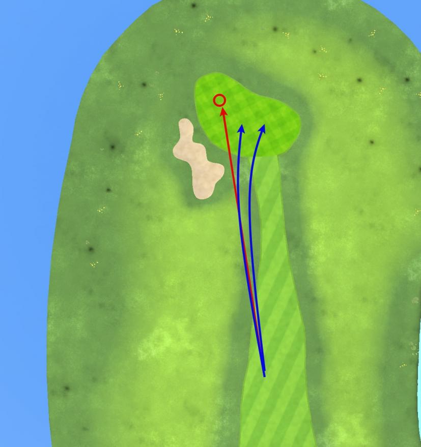 つまり、左ピンをドローで狙っていこうとすると、ピンより右サイドに打ち出していって、曲げて狙うということが想定されます。ちょうどよく曲がった時のみナイスショット。曲がらないミスはグリーンオン。