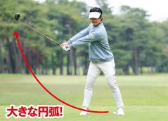 バックスイングの円弧を大きくすれば、左右対称形としてフォロースルーの円弧も自然に大きくなり、ヘッドスピードがアップします。クラブを自分で速く振るということではなく、スイング軌道が大きくなればクラブヘッドが加速してくれるのです。