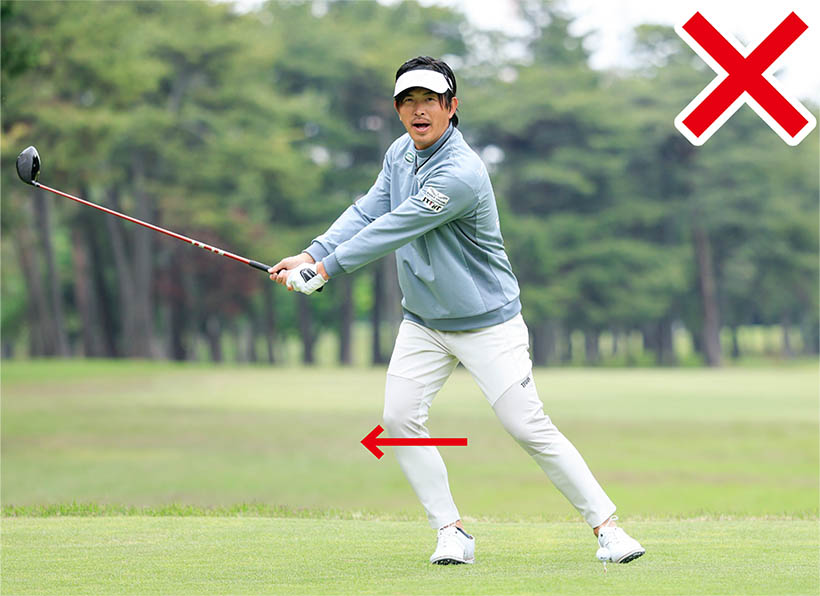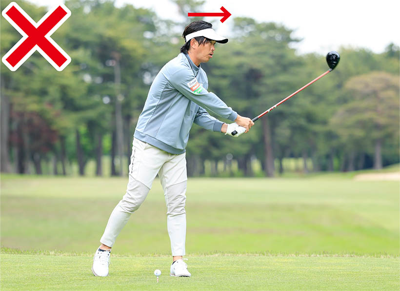 テークバックではクラブヘッドを低く真っすぐ引き、クラブヘッドの重さに引っ張られるような感覚でカラダをしっかりと捻りましょう。ただしバックスイングを大きくしようとして、上体が右にスエーしたり右ヒザや腰が流れたりしてはダメです。