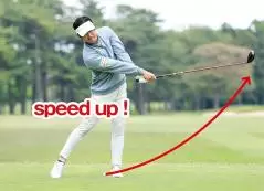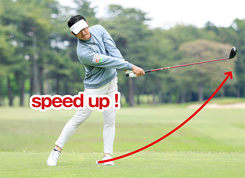 バックスイングの円弧を大きくすれば、左右対称形としてフォロースルーの円弧も自然に大きくなり、ヘッドスピードがアップします。クラブを自分で速く振るということではなく、スイング軌道が大きくなればクラブヘッドが加速してくれるのです。