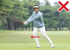 フォロースルーでもクラブヘッドの重さを利用する感覚がありますが、上体が目標方向に流れるのはNGです。腕とクラブが時計盤の3時のポジションでも誰かにクラブを引っ張られるイメージです。