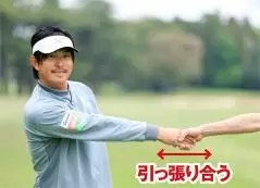 この場合は左隣の人と右手で握手し、お互いに引っ張り合う感覚です。バックスイングと同様、引っ張られるだけではいけません。クラブヘッドが遠くに進もうとする遠心力に対抗する向心力が大事なのです。