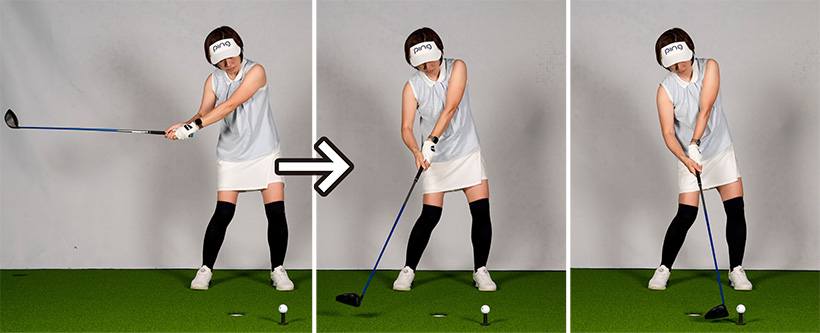 これを直すには、いま使っているドライバーで低い球を打つ練習をすること。あるいはカチャカチャがあればロフトを寝かせたり、シャフトを軟らかくして低い球を打つほうが効果的です。すごくやさしいスペックのクラブで打つほうが、スイング的には良化する可能性が高いのです。もちろん3Wや5Wで低い球を打ってもOK。十分にロフトがあるクラブでロフトを立てて打つと、強い球の打感やボールに力が伝わる感じがわかります。