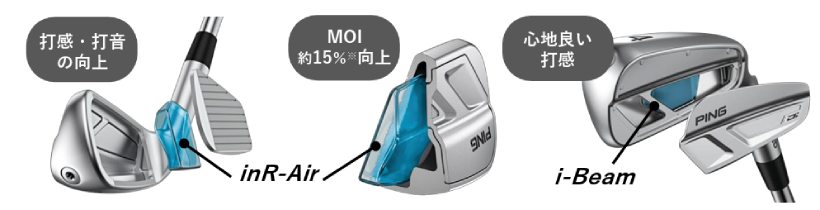 また、PINGの研究において、インパクト時の衝撃が「トップレール」や「背面」に集中することがわかり、衝撃・振動が集中する箇所に「i-Beam(アイビーム)」を搭載することで心地良い打感と打音を可能にした。