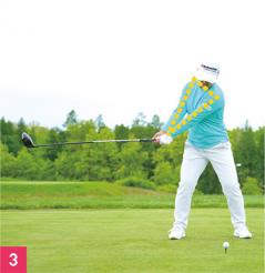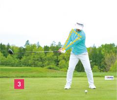 スイングアークは大きくても下半身は安定しています。トップで上半身が90度以上も回っているのに下半身はほとんど動かずに正面を向いています(写真04)。これは体の強さと柔らかさを兼ね備えている選手にしかできないスイングです。