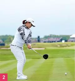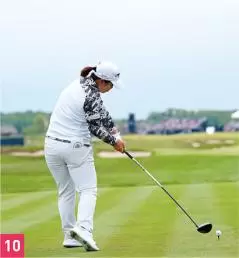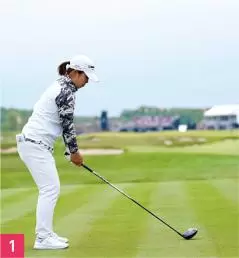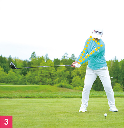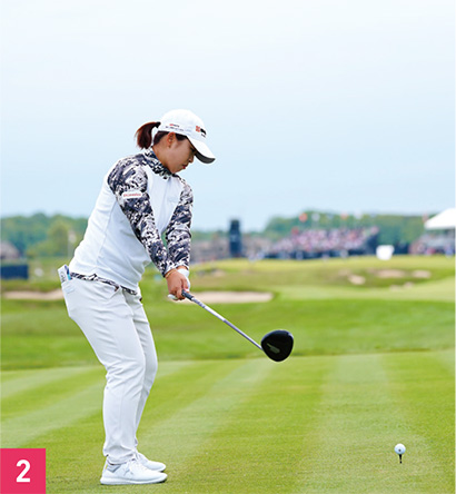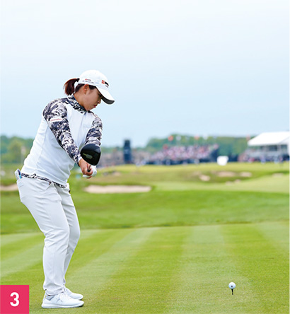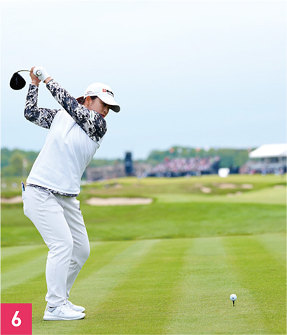 三角形をキープすることによってスイングアークも大きくなります。西郷選手は身長159センチと決して大柄なタイプではありませんが、平均飛距離は259ヤード。それだけ飛ばせるのは腕を伸ばして三角形をキープすることによってスイング軌道が大きくなるからです。