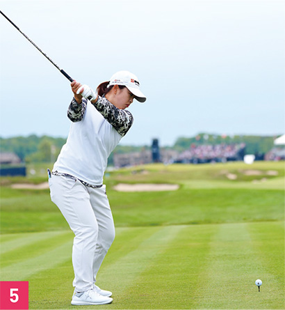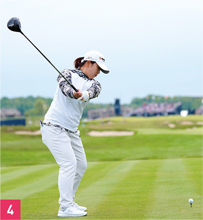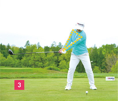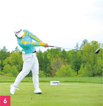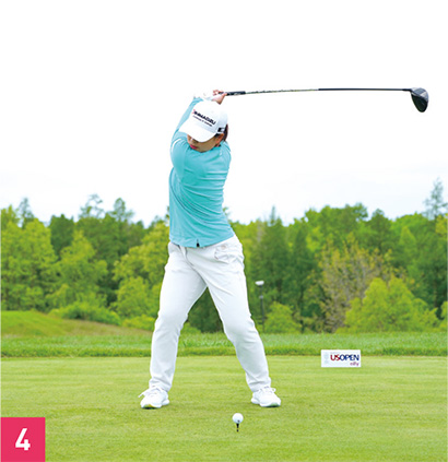 スイングアークは大きくても下半身は安定しています。トップで上半身が90度以上も回っているのに下半身はほとんど動かずに正面を向いています(写真04)。これは体の強さと柔らかさを兼ね備えている選手にしかできないスイングです。