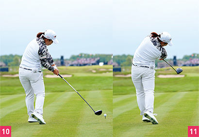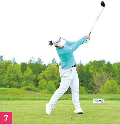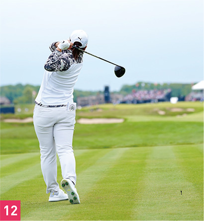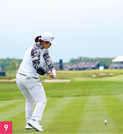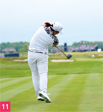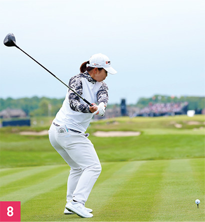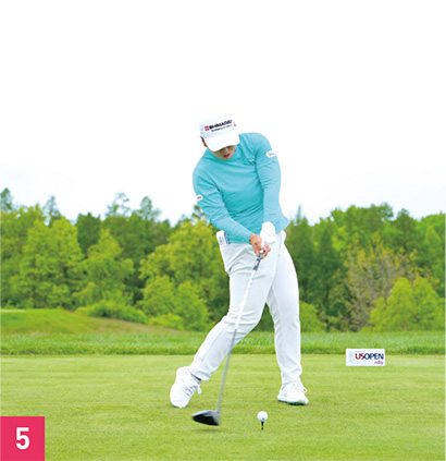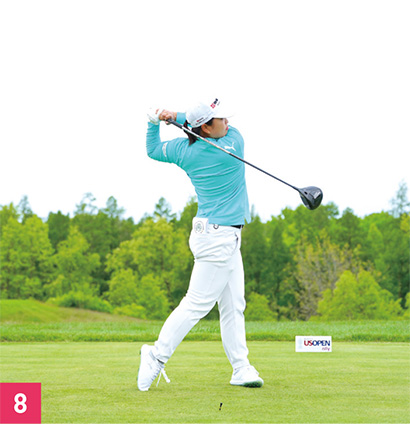もう一つは右足の使い方です。ダウンスイングでは右足をツマ先側に蹴って右ヒザを軽く曲げています(写真08)。右ヒザを曲げておくことで体全体が伸び上がらない。伸び上がりを抑えることも打球の方向性を安定させるには絶対に必要なポイントです。