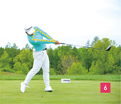 【連続後方 トップ〜フィニッシュ】上半身の回転でクラブを上げるとややアウトサイドに下半身リードの「間」で自然なインサイドループが生まれる