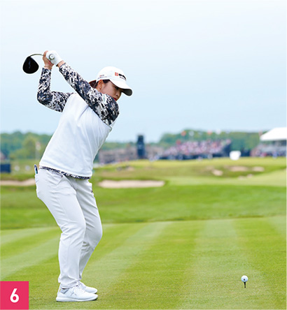 体を鍛えたことによって手を使わないスイングの完成度が高まりました。アドレスからテークバックにかけては両腕の三角形を綺麗にキープして(写真03)、三角形の形はフォロー(写真06)まで変わりません。手首の角度が変わらず、バックスイングからフォローまで両ワキを締めたまま打っています。手の動きを最小限に抑えることによってスイングの再現性が高くなりますし、打点も安定します。よくプロゴルファーは両ワキにタオルを挟んでスイングの練習をしていますが、西郷選手はタオルなしで、本番の試合でも完璧なボディターンで打っています。
