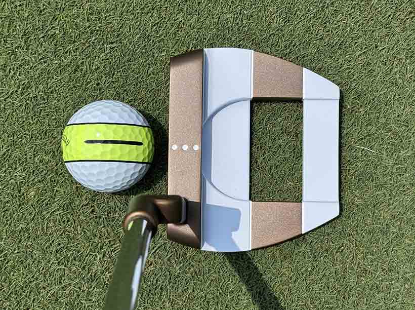 そしてもうひとつの特徴が名前にもある通り「Ai-ONE・インサート」。今やオデッセイのパターではすっかりお馴染みになったこのテクノロジーは、インパクトする側の樹脂製部分の裏面に、AIが設計した複雑な隆起を持つアルミ製のパーツが重ねられています。このインサートの効果で、トウやヒールに打点がずれてもボールスピードの減少が最小限に抑えられます。