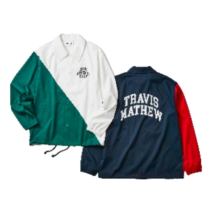 TravisMathewのシーズンテーマである“GlobalEntry Californiaは世界の国々と海でつながる”から、ヨーロッパ各国の国旗からインスピレーションされたキーカラー。そして、バンダナを重ね貼り合わせたような直線的な切替デザインは、NewVintageGolf ディレクター西脇氏がコレクションしているMadeinU.S.Aとも言えるバンダナからアイデアを取り入れている。