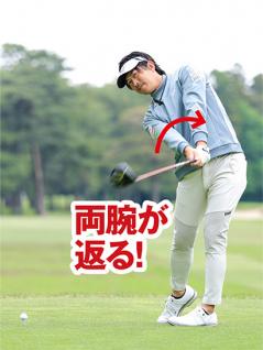 インパクトエリアで両腕を入れ替えるイメージでアームローテーションしたいのに右手首が手のヒラ側に折れてこね打ちになり、フェースターンができない。ヘッドスピードが上がらず、ボールは全然飛んでくれない。そんな悪循環に陥りやすいのです。