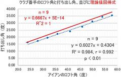 清永 図に示すように、アイアンの番手のロフト角を独立変数としてX軸に、トラックマンで得られた打ち出し角を従属変数としてY軸にプロットすると、これらの二者相関からは傾きが0.603の有意な一次回帰式が認められます。参考までに理論値は傾きが0.667の一次回帰式を赤い線で示してみましょう。