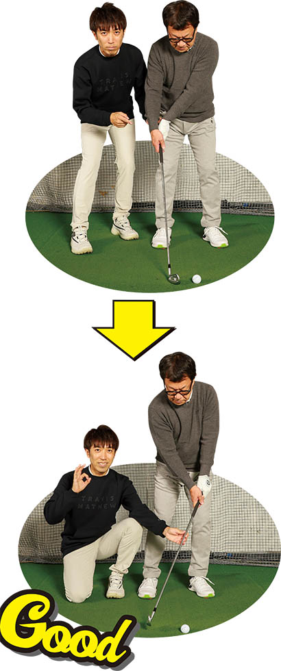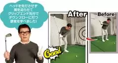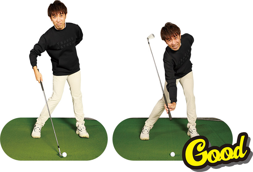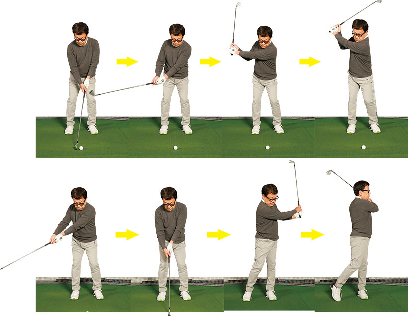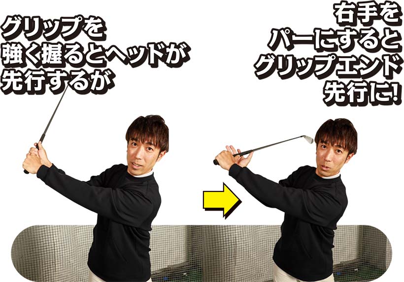 (写真左)ヘッドで打とうすると手が遅れてしゃくる動きになるが…(写真右)手で拾うイメージならグリップエンドが先に下りてくる!