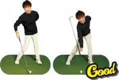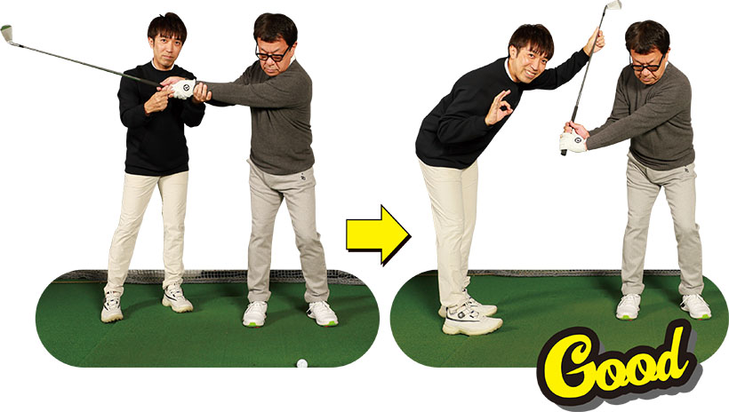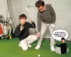 (写真左)道具のことは忘れ手を動かしてみよう!(写真右)このイメージがハンドファーストにつながる!