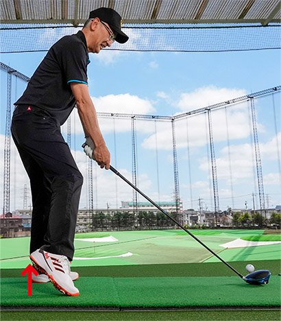 下の写真では分かりやすいように右カカトを大きく浮かせていますが、右足の踏み込みこそ手上げ防止のキーワードと断言してもいいくらいです。テークバックの始動のタイミングがとりやすくなり、下半身主導の飛ばせるバックスイングを完全マスターできます。