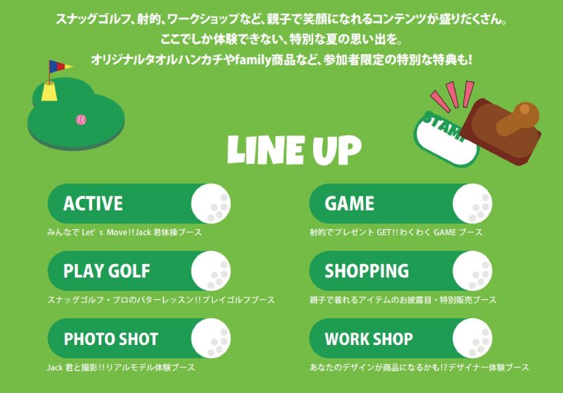誰でも楽しめる射的やゲーム、職業体験が出来るワークショップ、スナッグゴルフ体験やプロによるパターレッスン他、撮影ブースではプロのカメラマンによるリアルモデル体験を実施。