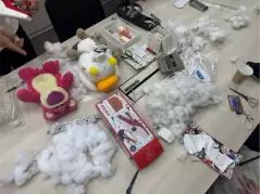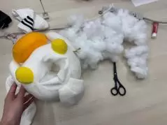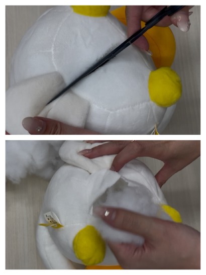 まずは、ぬいぐるみの中にある綿を適度に抜いていく。抜き過ぎるとスカスカになってしまうので、途中でクラブヘッドをぬいぐるみの中に入れたりして調整していく。このとき一番大切なことは、ぬいぐるみに謝りながら行うこと。
