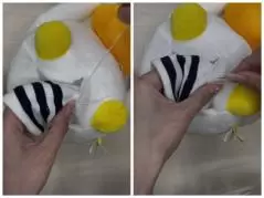 ソックスのくるぶしの部分とぬいぐるみを縫っていくだけ。この時、ソックスを少し出すので色や柄もぬいぐるみのデザインや雰囲気に合ったものだと、センス良し。