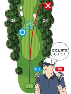 クラブの番手は思い切って下げること。ドライバーを3番ウッドに持ち替えるくらいでは中途半端です。UTとか6〜7番アイアン、あるいは自分の得意なクラブを選択するのが一番だと思います。
