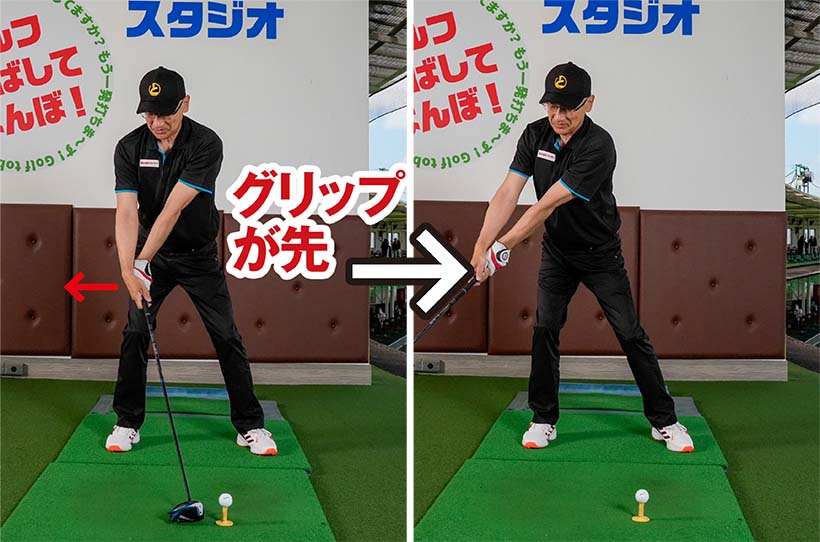 打ち急ぎの悪癖を直したいという人に、ぜひトライしてほしい練習法がもう一つあります。それはアドレスの姿勢を作ったら、グリップからテークバックを始動させるスイング練習です。