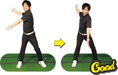 テークバックで左腰が伸び上がり前傾角度が崩れるため、それをダウン時に戻さなければならず……、この余計な動作が打点のバラつきにつながり正確に当てることだけに集中しすぎてフィニッシュまで振り切れていなかった!