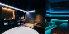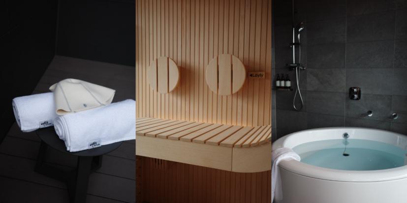 ジムの隣には、日帰りでも利用可能な貸切サウナを併設。サウナのために開発された人工石「ケルケスストーン」を使用したフィンランド式と、ベンチの下にヒーターを設置したモリス式を融合したハイブリッド型サウナ。静かな空間に広がるサウナ室の光が、心も落ち着かせてくれる。内気浴スペースにはゆったりとできる椅子が二つあり、お風呂も温水と水風呂どちらもあるのが嬉しい。