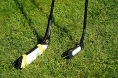 このパターのスペックは、ヘッドの重さは490g、長さは44インチ、ライ角は78度、ロフト0度でグリップは21インチ。通常のパターのグリップで持つと、ズシッとした重さを感じる。河本が言うように、思った通りに動かすのはかなり難しそうな印象。