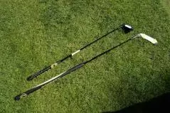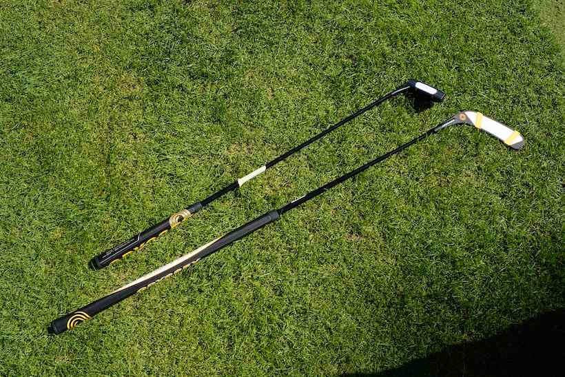 このパターのスペックは、ヘッドの重さは490g、長さは44インチ、ライ角は78度、ロフト0度でグリップは21インチ。通常のパターのグリップで持つと、ズシッとした重さを感じる。河本が言うように、思った通りに動かすのはかなり難しそうな印象。