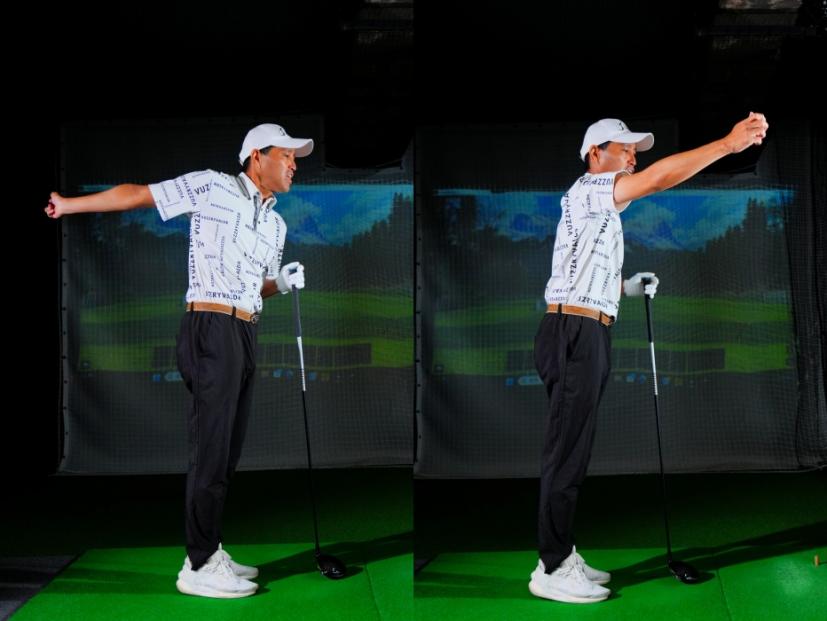 「自分では真っすぐ上げるイメージでも、それに体の回転が加わると『イン』になるんです。基本的に『手は真っすぐ引く』と言ったらこう引きます。首の付け根から右側、左側には絶対入らない。これが脱力して、真っすぐ引くところの正解です」(内海プロ)。