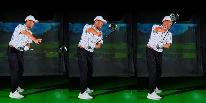 「引きすぎないようにアウトに上げればいいでしょうって、アウトに上げていって体を回せばシャフトクロスします。全然意味がありません。あくまでも手の動きは飛球線に沿って真っすぐ引いて引いて、最後に関節が自然に曲がる。この動きだけでいいんです。感覚としては飛球線に沿って上げているだけです。上げる位置が間違っていた人はアウトに上げているように感じるはず。それでいいんです、アウトに感じてください!」(内海プロ)