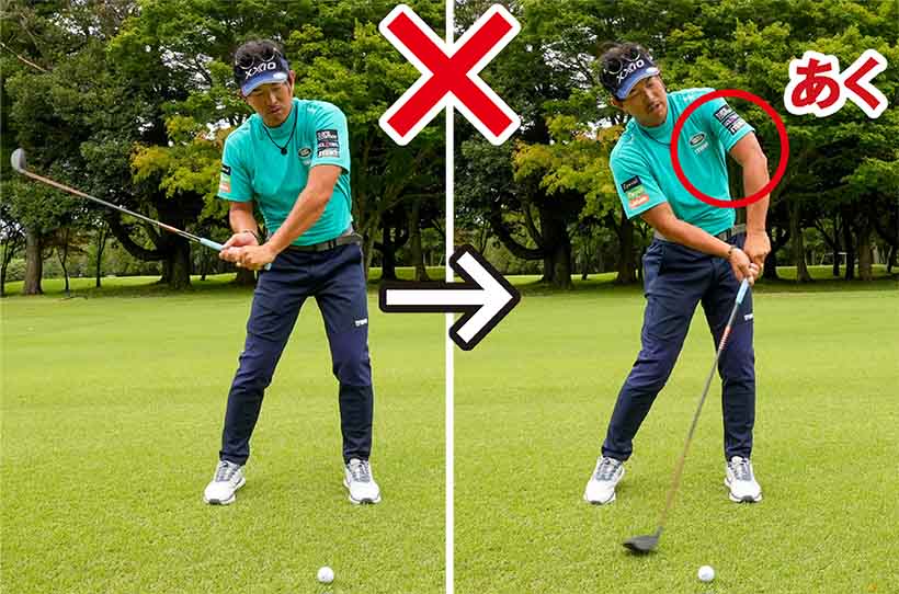 ワキが開くということは、スイングに「隙」が生じてしまうということ。カラダの回転と腕の振りが連動せず、スイングの軌道が安定しない。クラブの入射角が揃わないから、インパクトの打点がズレてしまう。3番ウッドが当たらない。飛ばないし、曲がってばかり。何しろ打ってみないと、ボールがどこに飛んでいくかわからないようなら、間違いなくワキが開いていて、スイングに隙がある証拠です。