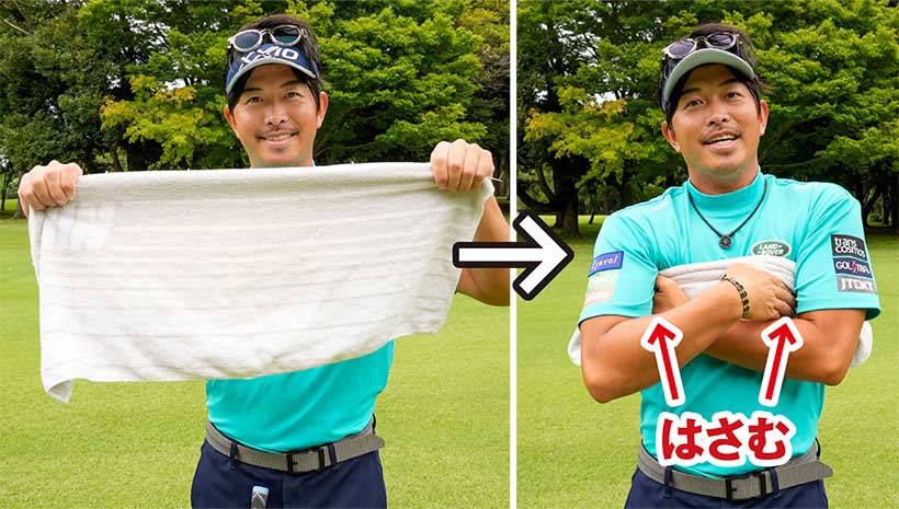両ワキにタオルをはさんで練習し、隙のないスイングを体感しよう