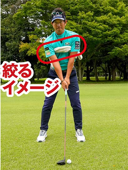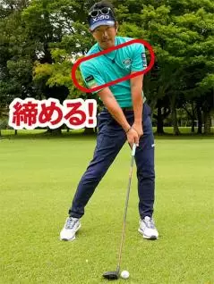 締めるというよりは、「絞る」イメージがいいと思います。両ワキを硬くしないで、絞っておくイメージによってグリップから両腕、両肩までが連動しやすくなる。そしてカラダの中心軸もキープしやすく、ミート率がアップします。