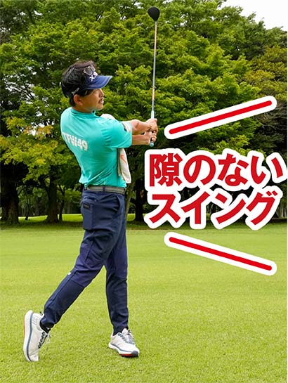 隙のないスイングを体感できたら、少しずつフルショットに近づけていきましょう。両ワキにタオルを挟まなくても、挟んでいるイメージで両ワキの絞り感覚を大事にすれば会心のロングショットが打てますよ。