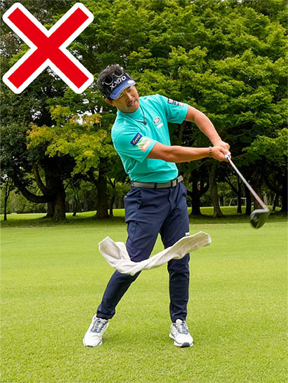 スイング中に両ワキに挟んだタオルが落ちてしまうのはNGですが、タオルを落とさないように両ワキを強く締めすぎるのもダメです。タオルを落とさないように、つまりスイングに隙が生じないようにする意識でOKです。