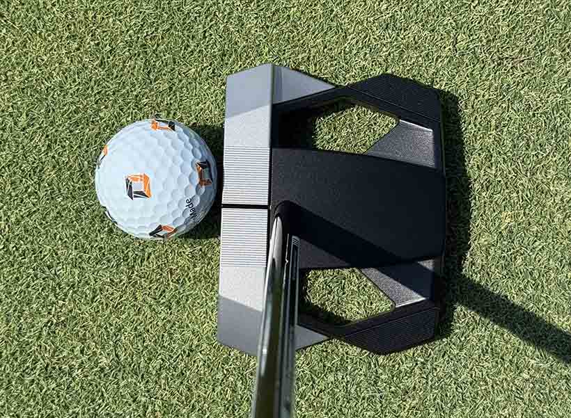構えてみると、ヘッド形状は「あ~スパイダーだな~」という顔をしています。ゼロトルクパターといえば、少し異形の物や、大きめヘッドが多い印象ですが、この「スパイダーZT」はあまり大きくないヘッドで、とても構えやすい。ゼロトルクパター感が少なく、シャフトの挿さっている位置を見なければ、普通のパターように感じます。形状的にもターゲットに対して構えやすいですね。