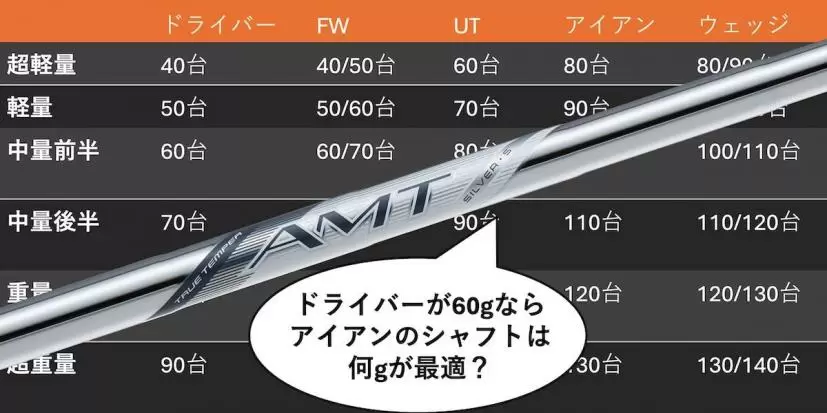 といった感じになります。表中にあるようにFWのシャフトはドライバーと同じにしてもOK。2〜3本入れる場合は、その中で重さを変えても構いません。例えば3Wをドライバーと同重量にし、6、7Wはそれより軽くするといった具合です。UTも同様で、上の番手が下の番手より重くならなければ組み合わせは自由です。昨今はドライバーのシャフトが表にあるより軽いこともありますが、その場合はFW、UTのシャフトも軽くします。