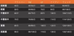 重量フローはどこを基準にしてもいいですが、クラブの本数が多く、セットの根幹を成すアイアンから割り出すのがいいと思うので、ここではアイアンのシャフト重量から他のクラブのシャフト重量の目安を探っていきます。まずは下の表を見てください。