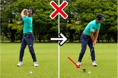 最初のうちはトップとフィニッシュを低く抑えたコンパクトなスイングでも構いませんから、ボールを緩やかダウンブローにヒットすることに専念しましょう。カラダをしっかり回転することが大事ですが、軸が左右にブレたり頭が上下動したりしてはいけません。