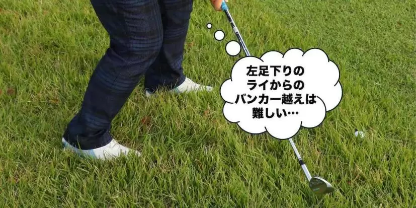 左足下がりではスピンを聞きづらく、バンカーを越えても止まらずにグリーン奥まで転がってしまうこともすくなくありません。