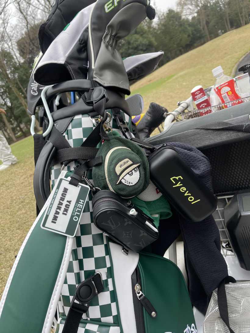 キャディバッグにじゃらじゃらとつけているものたち…。ネームタグは「HIIT」のものでカラーはグリーン。プレゼントでいただいた「VUITTON」のゴルフボールケースに、「malbon golf」のミニポーチ。サングラスケースは「Eyevol」で、欠かせないスピーカーは「JBL」のゴルフバッグにもカートにもつけられるミニタイプのもの。