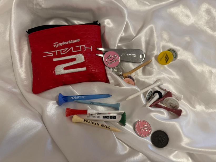 ティはツアーティを使うことがほとんど。なくならなくて折れないので、ずーっと同じものを使いがち。(笑)グリーンフォークは、以前訪れたゴルフ場のものをとラコステゴルフのものを。なくなってもいいように、とにかくティやマーカーなどをごそっと入れている。