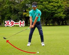 そこでぜひやってほしいのが、アドレスの姿勢を作ったら一度インパクトのカタチを作り、そこからテークバックをスタートするというメソッド。アドレスの姿勢から腰を左に少し回し、体重を左足に乗せて両手を左モモの前に移動させます。こうしてハンドファーストの体勢を作ってからアドレスの体勢に戻し、その流れのままでバックスイングに入っていくのです。