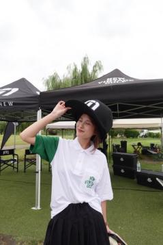 私がこの日着用したのは、バイカラーポロシャツのホワイト。Sサイズを着用。ユニセックスなのでオーバーサイズで着ているのが可愛い。差し色のグリーンがお気に入り。