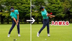 この練習を繰り返すとインパクトエリアで左手グリップの小指側やグリップエンドを支点にして、両腕を入れ替える感じでクラブを振り抜く感覚がつかめます。